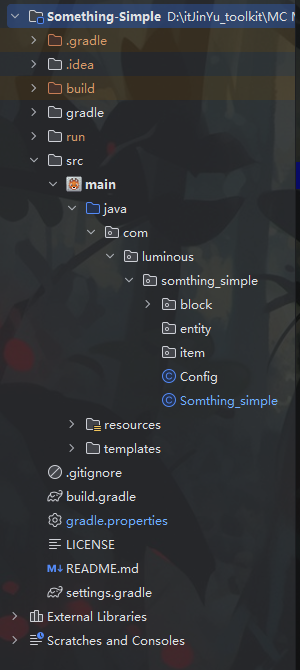 构建好以后项目文件目录大致是这个样子(block、entity、item包是我后来加的,所以刚开始没有.PS:当时我写的mod名为Something Simple)